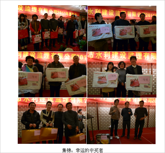 2012年1月11日是我們水利監(jiān)理員工分享快樂的日子,此刻全體員工歡聚一堂,忘記了一年來的辛勤工作,臉上都洋溢著幸福的歡笑。晚宴進行的同時,還穿插著獎品豐富、激動人心的抽獎活動。整個年會在和諧、溫馨的氣氛中圓滿結束!