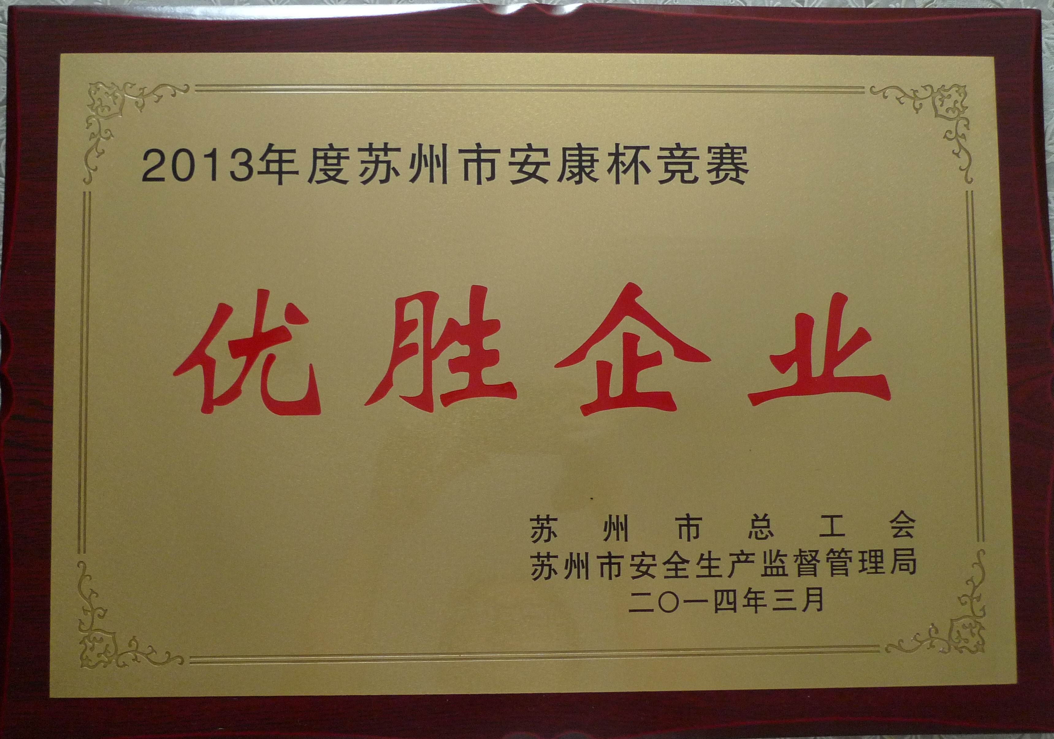 根據(jù)蘇州市總工會 、蘇州市安全生產(chǎn)監(jiān)督管理局、蘇工辦 (2014) 22號 文件,為表彰我公司在2013年度積極組織實(shí)施群眾性安康工程,全面推進(jìn)現(xiàn)代化安全生產(chǎn)管理,安全文化建設(shè),職工安全健康培訓(xùn)教育, 蘇州市總工會、蘇州市安全生產(chǎn)監(jiān)督管理局特授予蘇州市水利建設(shè)監(jiān)理有限公司 2013年度”安康杯”優(yōu)勝企業(yè)”!