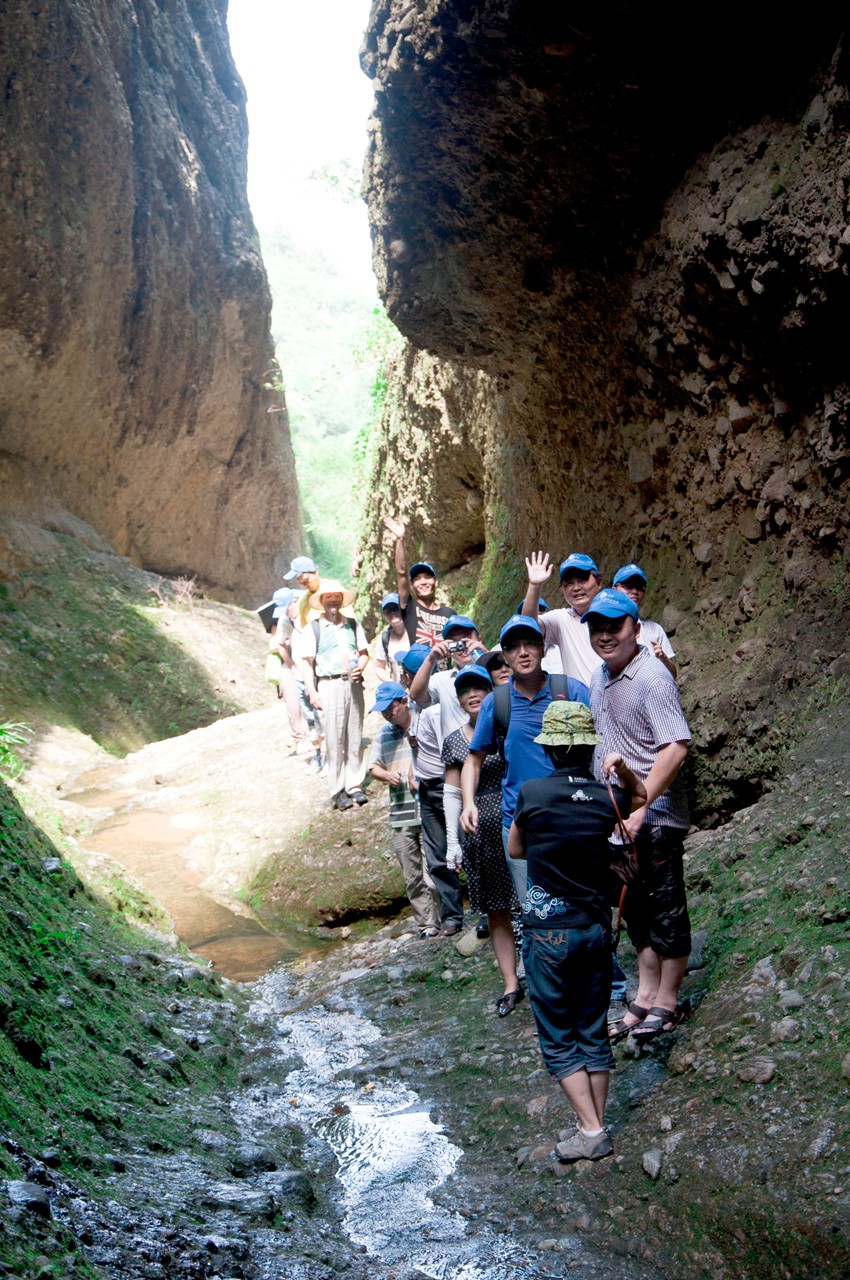 皖西大裂谷原名避王巖。沿著盤龍九曲的山間小路來到大裂谷的入口,才發(fā)現(xiàn)它的壯觀真是罕見。一汪清澈的池水,一溪細細的激流,便是大裂谷的入口。大裂谷從下到上全長1500米,石壁遍生青苔,泉水淙淙,稍不留神就會從峭壁上滑落下來,后果不堪設(shè)想,所以只能沿墻摸壁探索前進。在巖壁的夾縫里面,天空越來越窄,水流越來越急。四周幽黑寧靜,仿佛與世隔絕。地道的“一線天”呀。谷中幾乎沒有道路可言,有三道關(guān)隘閘口。時而巨石懸空,觸目驚心;時而幽深奇崛,飛流四射。腳下,更是越來越難覓踏足之地。我們搖搖晃晃,尋尋覓覓;我們聚精會神,我們一步一歇。我們在窄窄的大裂谷中艱難攀爬,其行進過程是:雙腿“八”字,沿墻摸壁;手腳并用,東瞧西覓;拉繩握釘,屏住呼吸;驚心動魄,小心翼翼。有人形容其行進過程活像個“小偷”。這種富有驚險刺激和探險挑戰(zhàn)的穿越,我還是人生中的頭一回。站在出口處,我回首望去,大裂谷宛似天工將高山劈作兩半,對峙相望成V字型。作為華東地區(qū)絕無僅有的地質(zhì)奇觀,大有“一夫當(dāng)關(guān),萬夫莫開”之勢。