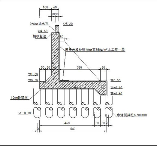地基處理設(shè)計(jì)為Φ60@100cm的水泥攪拌樁,正方形布置,設(shè)計(jì)樁長(zhǎng)8米,樁頂高程為▽-0.1米,樁底高程設(shè)計(jì)為▽-8.1米。(詳見附圖)設(shè)計(jì)單樁承載力100kN,復(fù)合地基承載力110kPa,要求水泥摻量不小于15%,28天無側(cè)限抗壓強(qiáng)度不小于1.2MPa。
